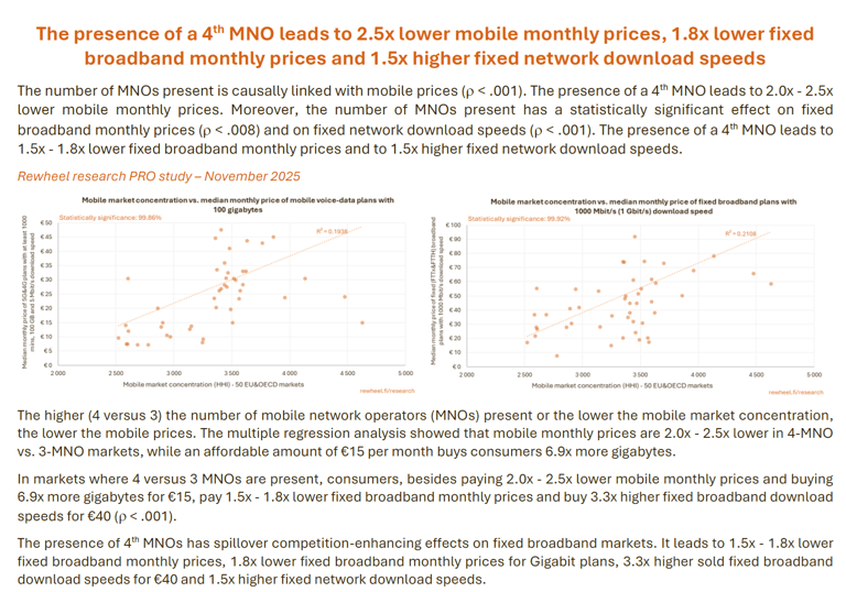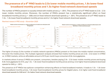 The presence of a 4th MNO leads to 2.5x lower mobile monthly prices, 1.8x lower fixed broadband monthly prices and 1.5x higher fixed network download speeds